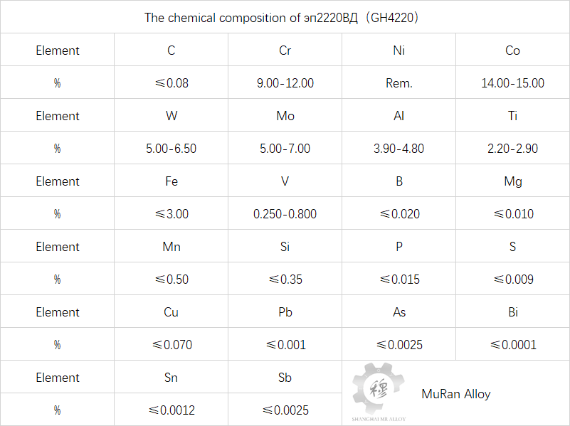 эп2220BД(GH4220)alloy is a nickel-based aging precipitation-hardening high-temperature alloy that China has copied from the former Soviet Union, ХН51ВМТЮКФР⁃ВД. The alloy is based on Ni, with approximately 11%Cr, 15%Co, 6%W, 6%Mo, and 0.5%V added as solid solution strengthening elements, 4.5%AI and 2.5%Ti as aging strengthening elements, and C, B, Ce, and Mg as microalloying elements.