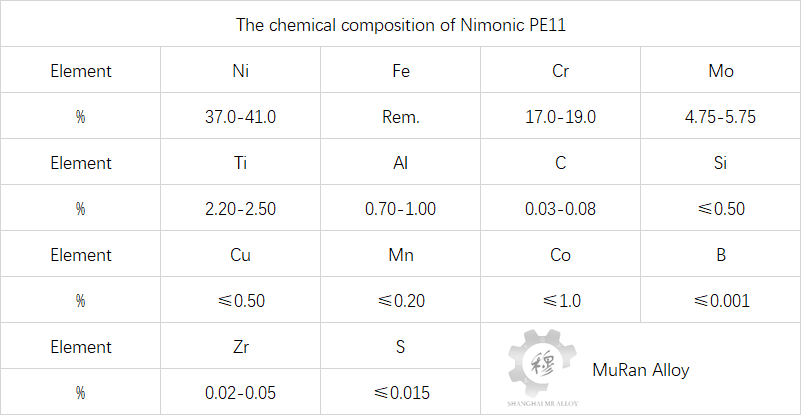 Nimonic PE11 is a nickel-iron-chromium alloy that is hardened by the precipitation of titanium and aluminum and strengthened by the solid solution of molybdenum. It has been developed as a high-strength sheet alloy for use at temperatures of 1020 ° C (550°F). The high iron content provides good machinability and also has high tensile toughness, especially after welding. Components for gas turbines.